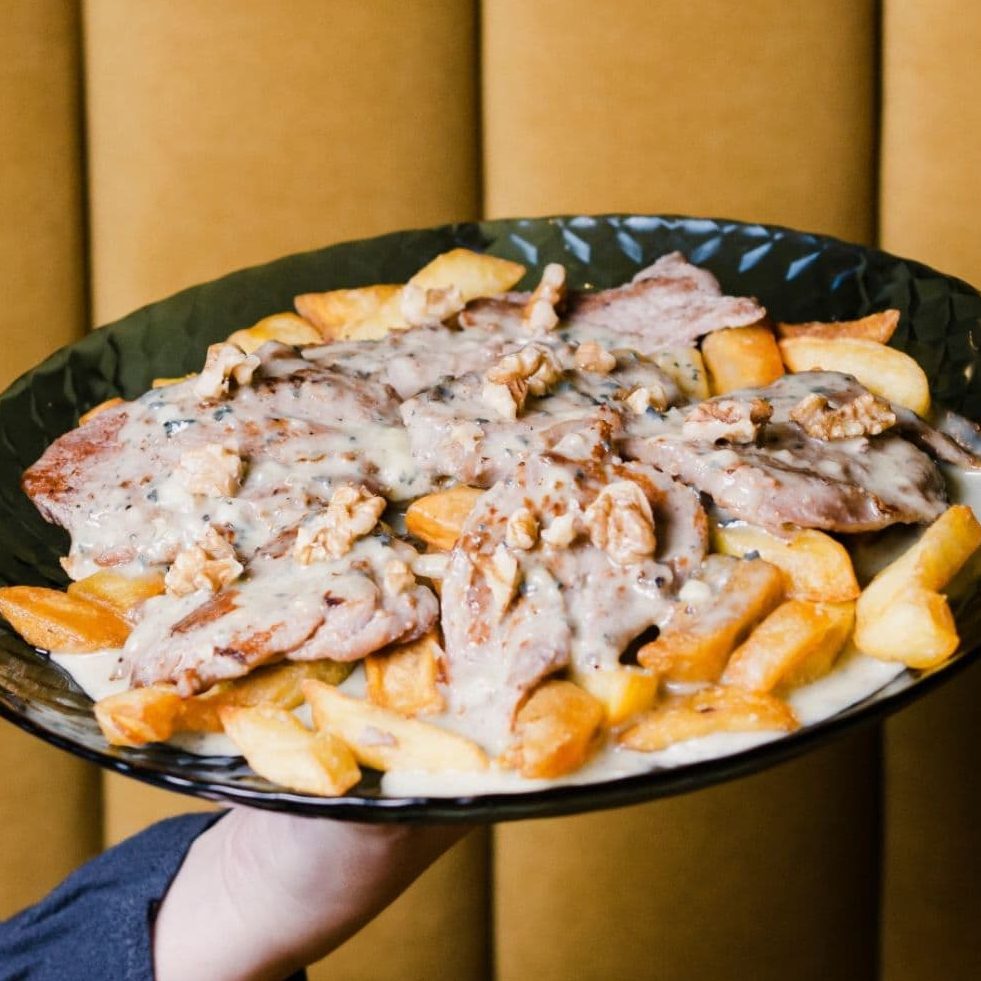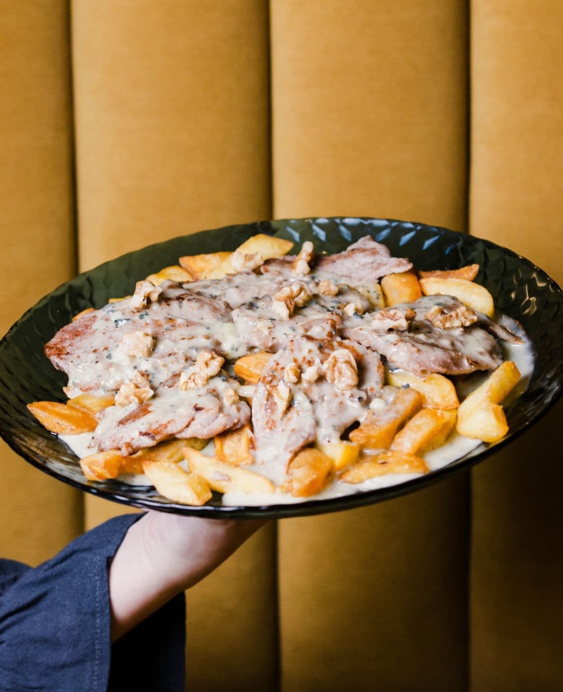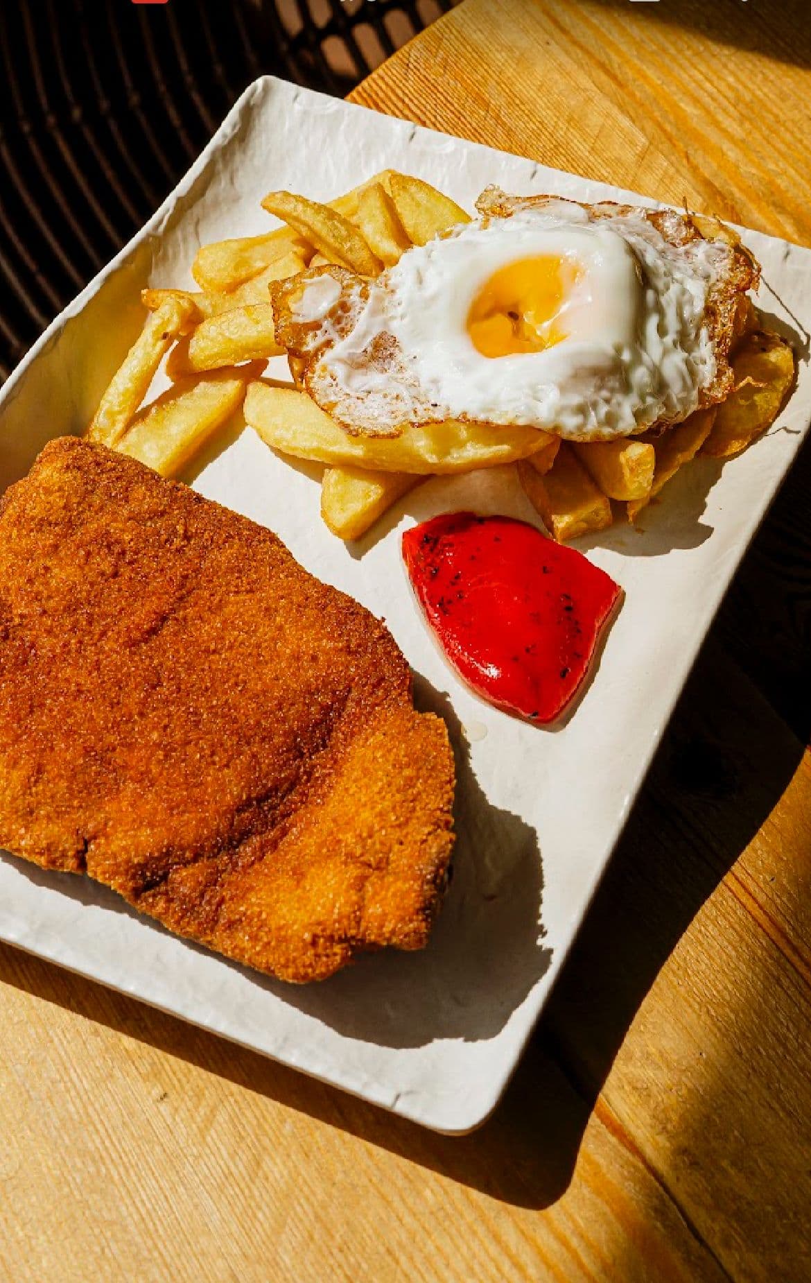 Hamburguesa vegana, en pan de hamburguesa, lechuga, tomate y cebolla con patatas fritas